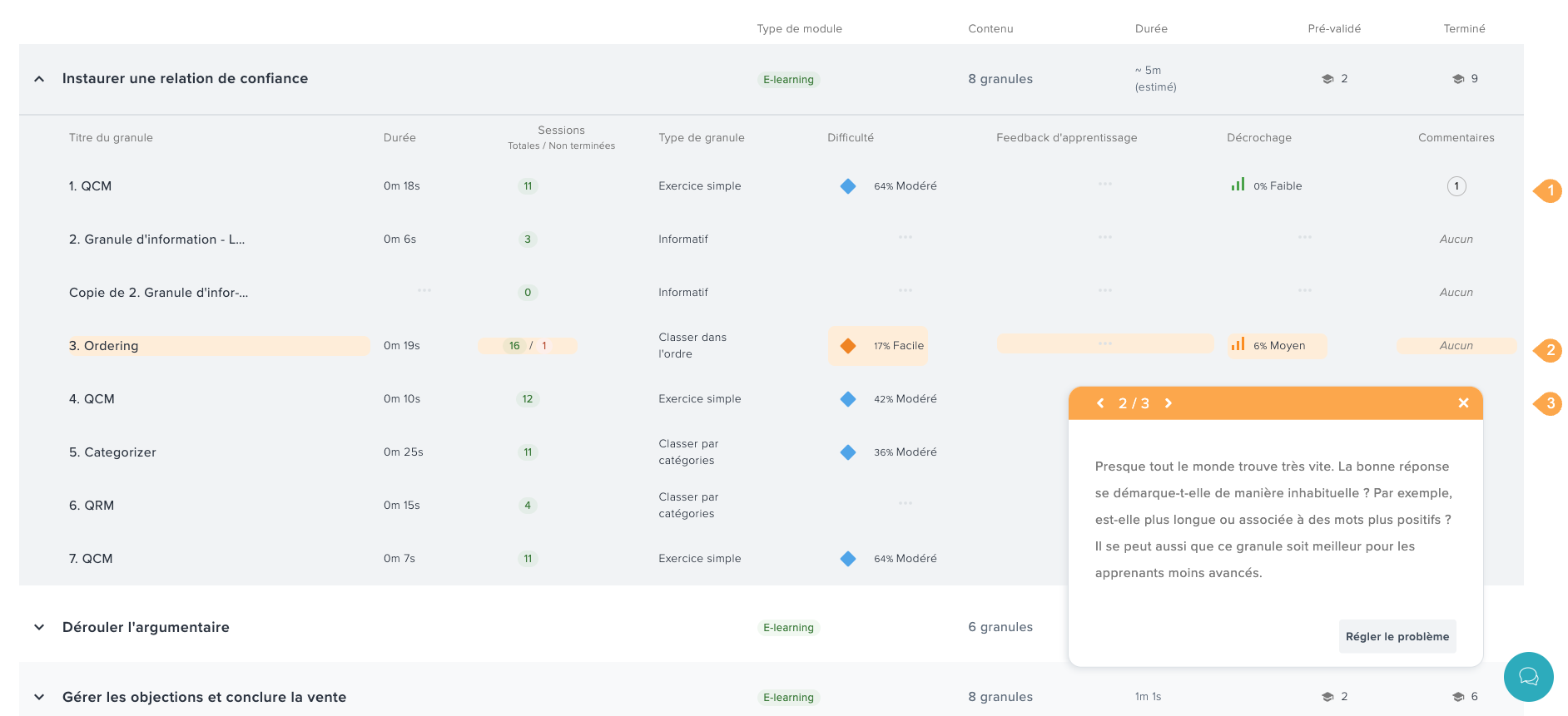 With the integration of advanced analytical tools, Didask allows trainers and training managers to monitor learners' progress in real time. Where Didask goes further than the LMS on the market, is that its AI directly formulates recommendations for improvement where it has analyzed that there is the most need, based on the data collected. This allows you to identify biases that are not always visible to the naked eye and saves valuable time by avoiding reviewing all of your modules every morning. For example, in an exercise with several possible answers, the AI will detect an answer whose text is much longer compared to the others, which can give an indication that the learners' behavior during the exercise is biased.