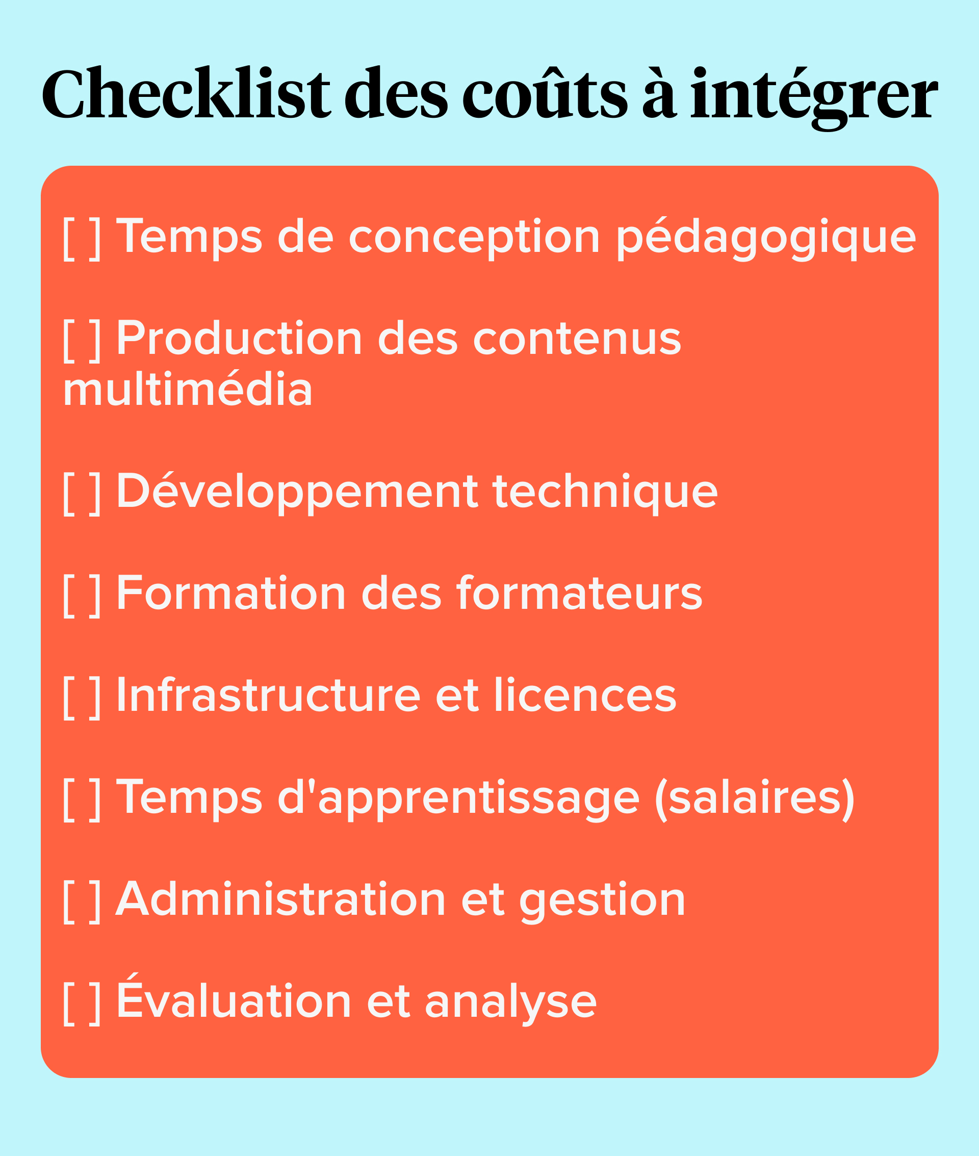 Le "I" dans ROI représente l'investissement total, pas seulement les dépenses visibles. Pour obtenir un calcul correct du retour sur investissement, vous devez d'abord capturer l'intégralité des ressources engagées dans votre action de formation.
